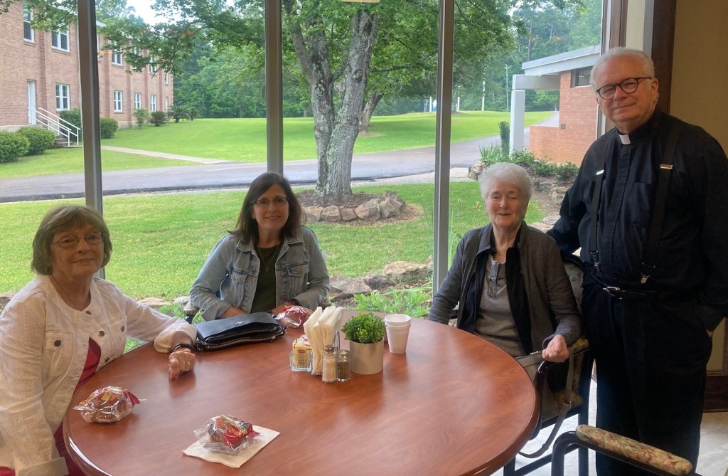 I met so many wonderful people at the retreat. These are three ladies that I grew close to Jean, Cathy, and Iris, with Father Walsh. He came over to explain the question that Mary remained a Virgin all her life and Jesus had no brothers. A questions that confuse people.