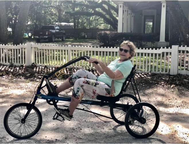 I haven’t ridden a bike in years because my knees have gotten stiff at eighty. I thought I could ride a three wheel bike but that didn’t’t work either. Then they brought the recumbent bike out and when I sat in the seat of this adult tricycle I said “Yes” this works! One day I rode 3.4 miles and was a proud as a peacock!. What fun to have at Eighty.
